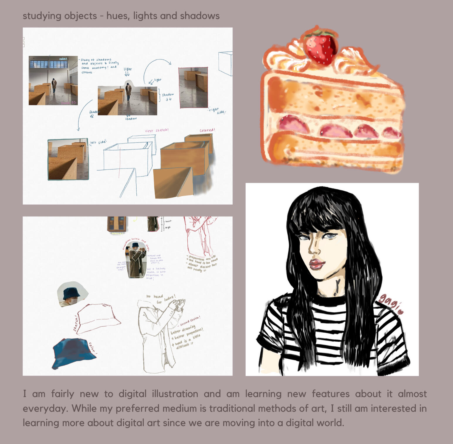 Hello there ! My name is Gayathri but I go by my preferred name gagi (Gaa-Gee). My pronouns are she/they.I've created this portfolio to showcase some of my work and my skills. I have been pursuing art and design and hobby for over 3 years now.I started with traditional art during the first year of pandemic, in 2020, and slowly developed my sketching skills over time by practising portraits.As university years progress, I have recognized my interest in organizing and representing information in an appealing and an easily appetizing way for viewers. Often information is missed out by readers because of the lack of or often excess information displayed on visual medias. This realization led me to take up the role of Graphic Designer for my faculty's Undergraduate Society.
