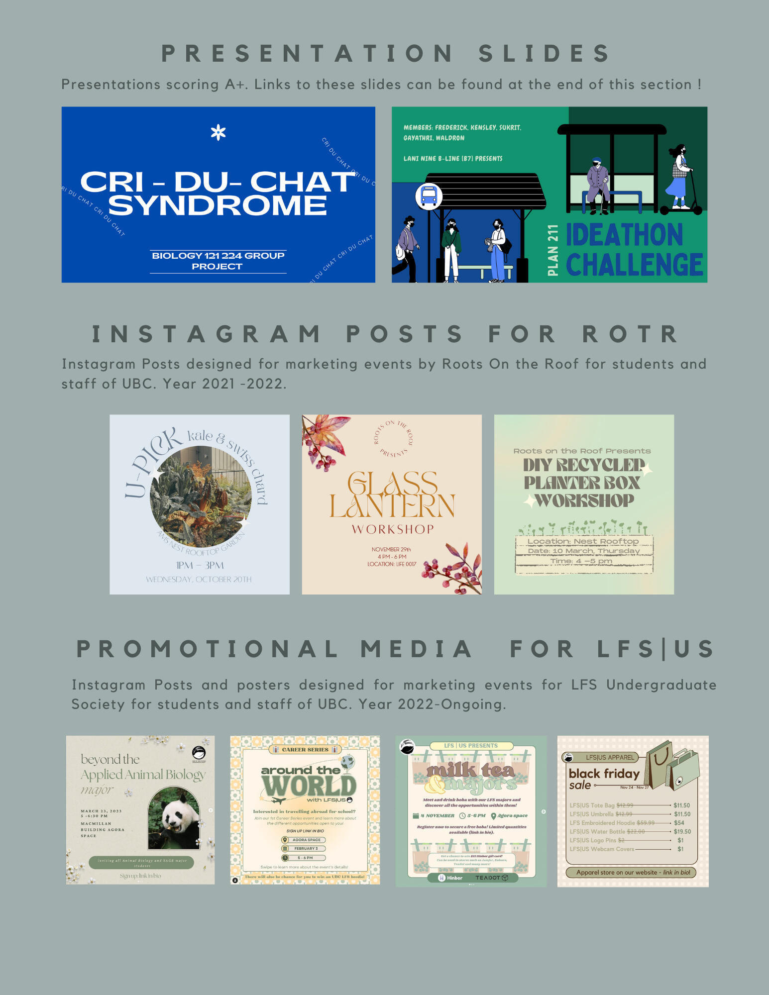 instagram posts for student-led club, presentations for academics and experimental lyric art.